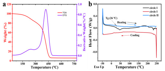 Figure 5. (a) TGA (red curve) and DTG (blue curve) thermograms; (b) DSC thermograms of NIR-CDs.