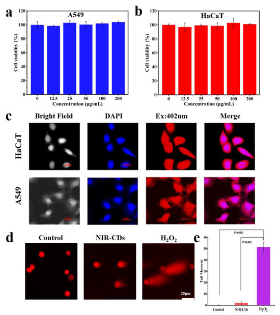 The in vitro fluorescence imaging was carried out using HaCaT and A549 cells. Under blue (402 nm) excitation, bright red light (NIR-CDs) and blue light (DAPI) were observed, as shown in Figure 6c. These images demonstrate that the NIR-CDs can enter and label living cells. The excitation at 402 nm revealed that the bright red fluorescence is mainly concentrated in the cytoplasmic region. The merge images showed minimal overlap between the NIR-CD and 4′,6-Diamidino-2-phenylindole (DAPI) fluorescence, indicating that only a small portion of the NIR-CDs are located in the cell nucleus [56,57]. To investigate whether the NIR-CDs affect DNA replication and transcription, a comet assay was conducted to study the genotoxicity of the NIR-CDs on HaCaT cells. Compared to the control group (Figure 6d,e), the HaCaT cells treated with 200 µg/mL NIR-CDs showed no significant comet tails, while the positive control group treated with H2O2 (300 µM) displayed significant tailing. These results indicate that NIR-CDs are not genotoxic to HaCaT cells, suggesting their potential as bioimaging agents [58].