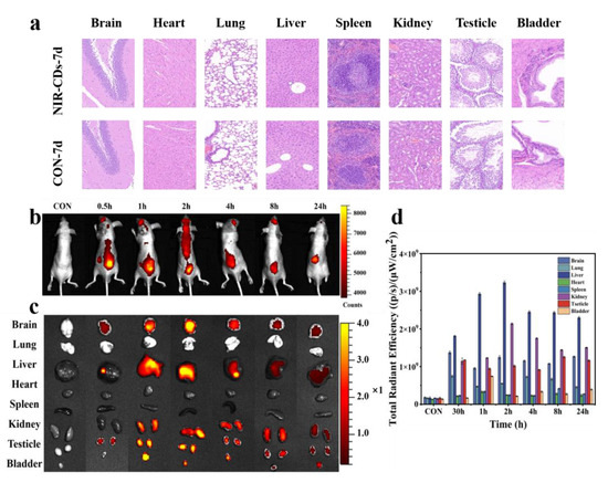 The introduction of carbon nanomaterials into the human body may lead to organ damage. Therefore, the in vivo toxicity of the NIR-CDs in various organs (including the brain, heart, liver, lungs, kidneys, spleen, testicles, and bladder) was further assessed in nude mice using histopathological analysis. As shown in Figure 7a, seven days following NIR-CD injection, no histological abnormality was evident in the vital organs, including the heart, brain, spleen, lung, liver, bladder, testis, and kidney, in both the experimental and control groups. These findings suggest that NIR-CDs do not exert any adverse effects on these organs in the short term (7 days), supporting their potential in bioimaging applications. In summary, our preliminary evaluation clearly demonstrated the safety and biocompatibility of NIR-CDs for deep tissue bioimaging [59,60]. These results provide a solid foundation for the further exploration and utilization of NIR-CDs as an effective tool in biomedical research and clinical practice.