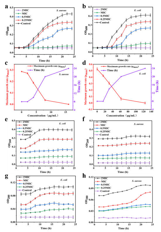 Figure 8. Growth curves of (a) S. aureus and (b) E. coli treated with different concentrations of NIR-CDs. The maximum growth rate (μmax) and culture time to reach the μmax for (c) S. aureus and (d) E. coli after NIR-CD treatment. (eh) Effect of NIR-CDs on the ultraviolet absorption of S. aureus and E. coli at OD260 and OD280.