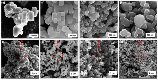 FESEM images of TiO2 nano-cuboids prepared under different reaction temperature conditions at 24 h: (a,e) TN-175 °C; (b,f) TN-200 °C; (c,g) TN-225 °C; and (d,h) TN-250 °C.