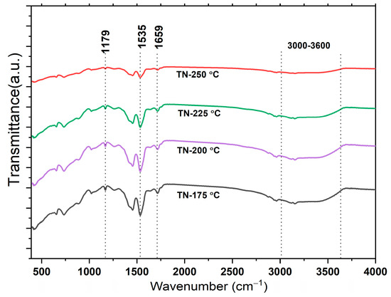 Figure 3 displays the Fourier transform infrared spectroscopy (FTIR) spectra of TiO2 NCs synthesized at various temperatures for 24 h. Ti-O stretching and Ti-O-Ti bridging stretching modes are responsible for the bands seen between 400 and 1000 cm−1. The stretching of the O-H mode of the hydroxyl group causes the broadband between 3000 and 3600 cm−1. The band at 1659 cm−1 for the TiO2 nanoparticles is attributable to the O C-O-Ti link of the carbonate structure [28]. The 1535 cm−1 band represents N-H in-plane bending and C-N stretching vibrations, while the 1179 cm−1 band is caused by C-N stretching [34]. There are no nitrogen-related bands in TiO2, implying that the N species are interstitial. As the reaction temperature rises from 175 °C to 250 °C, the O-H stretching mode of the hydroxyl group becomes weaker.