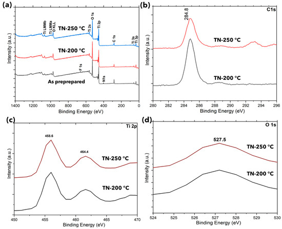 For better comparison, X-ray photoelectron spectroscopy (XPS) analysis is conducted on the specimens developed at 200 °C and 250 °C and the specimen without post-treatment (see Section 3.2) to understand the role of the selected synthesis solution (TN-200 °C, TN-250 °C) on their structural compositions (Figure 4). The broad scan survey spectrum indicated that TiO2 particles include C, N, Ti, and O elements, with photoelectron peaks with binding energies of 284.8 (C 1s), 400.09 (N 1s), 458.8 (Ti 2p), and 527.5 (O 1s), respectively. The untreated material showed the 683.88 eV (F 1s) peak, demonstrating the removal of surface fluorine and other residual organic compounds following post-treatment. Ionic liquids are an environmentally friendly and operationally safe alternative to other corrosive fluoride sources, such as HF [35]. The [bmim]+ ion adsorbed on the surface of TiO2 nanocrystals is responsible for the N 1s peak at 401.1 eV. The nitrogen atoms in the C-N bonds may come from the capping agent or the precursor. Moreover, the C–O bond is responsible for the weak peak at 284.8 eV (Figure 4b) [36,37]. Numerous studies have connected carbonate species, namely Ti-O-C, on the TiO2 surface to C dopants. On the other hand, substitutional C-doping can be excluded, due to the absence of a peak at 281–282 eV, which is characteristic of Ti-C bonding (O-Ti-C linkage). According to Figure 4c, the binding energies of Ti 2p3/2 and Ti 2p1/2 are 458.8 and 464.4 eV, respectively. This suggests that the surface Ti oxidation state is identical to that of bulk TiO2 [37,38,39]. As seen by the approximately 5.7 eV split between the Ti 2p1/2 and Ti 2p3/2 core levels, the Ti4+ in the TiO2 is in a normal state. It is important to note that although the different calcination temperatures lead to the significant surface morphological refinement of TiO2 particles, from nano-cuboids to nano-bipyramids, their chemical composition is comparable for both types of surface morphologies.