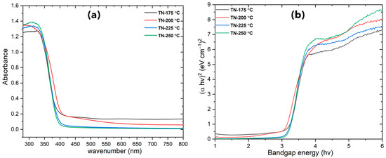 The bandgap energies (Eg) of synthesized TiO2 NCs may be determined using Tauc plots, taking into account that TiO2 is an indirect bandgap material. Figure 5b depicts a plot of (αhv)2 against hν, where α is the absorption coefficient and hν is the photon energy. The bandgaps of the TiO2 NCs synthesized at 175 °C, 200 °C, 225 °C, and 250 °C were 3.16, 3.05, 3.14, and 3.12 eV, respectively. It was found that surface carbonaceous and carbonate species, as well as interstitial nitrogen species (Ti-O-N), did not significantly alter the TiO2 bandgap. What should be underlined is that, in comparison to structural studies (XRD), the analysis of the pure anatase form demonstrates a smaller bandgap, which can lead to absorption in the visible energy range, thereby increasing TiO2 photoconversion efficiency.