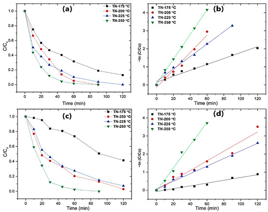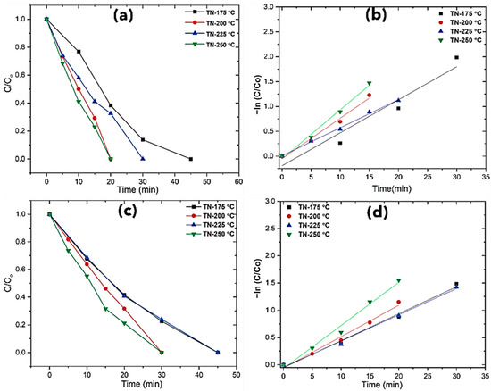 Two critical factors that greatly influence a catalyst’s photocatalytic efficiency are its specific surface area and crystallinity. More active sites are available on a surface with a larger specific surface area, which allows electrons and holes to go further without recombining. TN-200 °C and TN-250 °C have higher photocatalytic performance than TN-175 °C and TN-225 °C because of their lower dispersity in shape and their improved crystallinity. Improved crystallinity facilitates the charge carriers’ migration to the surface free from defects. These act as recombination sites for carriers produced by photolysis and boost photocatalytic activity. Under UV light, titania absorbs photons (Equation (2)) and ionizes oxygen (Equation (3)). The photo-holes neutralized the (OH) groups, producing the hydroxyl radical (OH•), as shown in the equation (Equation (4)). The resulting OH• radials can oxidize organic contaminants (Equation (5)) or react directly with holes (Equation (6)) [16,20,21,49]. Nanostructured materials have a high surface area-to-volume ratio and unique properties that enhance photocatalytic treatment and catalytic efficacy.