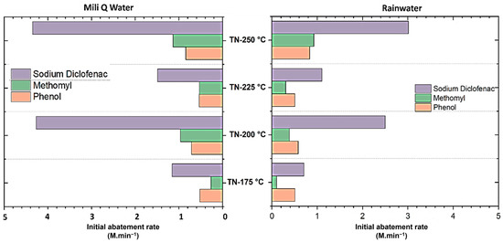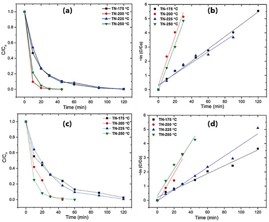 As was previously discussed, diclofenac breaks down under photocatalytic treatment into a variety of species, resulting in the identification of many hydroxy- and dihydroxy-diclofenac derivatives, which were then further converted into derivatives of chloro- or hydroxyl-phenol. Complete mineralization is eventually attained through the ring opening, which leads to the production of dicarboxylic acids [46,47,48]. Figure 8 depicts the time profiles of the DCF concentration in ultrapure water and rainfall exposed to UV radiation. During the experiment, it was observed that the degradation of diclofenac was minimal in the absence of a photocatalyst. The degradation rates measured in ultrapure water were higher than those obtained with stormwater, which might be attributable to the presence of salts that can adsorb the degradation process. As shown in Figure 8, and as summarized in Table S5, TN-175 °C and TN-225 °C had approximately 99% degradation in 120 min, whereas TN-200 °C and TN-250 °C had remarkably fast degradation in just 45 min in UW, while it was 45 and 60 min in rainwater, respectively. The maximum TOC removal of 79% was achieved with catalyst TN-250 °C in UW, and it was 67% for rainwater, as shown in Table S4 (Supplementary data).