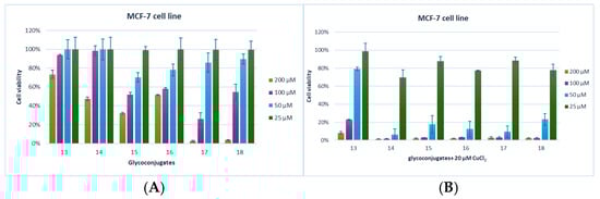 The dependence of MCF-7 cell proliferation on the concentration of glycoconjugates 13–18 in the absence (A) and the presence (B) of 20 µM of Cu2+ after 72 h incubation. Cells in a culture medium (A) or cells in a culture medium with the addition of CuCl2 at 20 µM (B) were used as a reference for 100% cell viability. Data are presented as the mean ± standard deviation (n = 3).