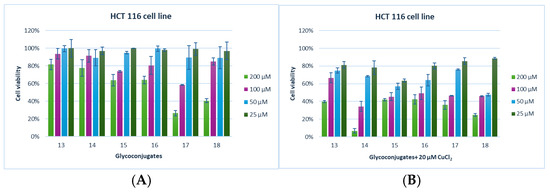 The dependence of HCT 116 cell proliferation on the concentration of glycoconjugates 13–18 in the absence (A) and the presence (B) of 20 µM of Cu2+ after 24 h incubation. Cells in a culture medium (A) or cells in a culture medium with the addition of CuCl2 at 20 µM (B) were used as a reference for 100% cell viability. Data are presented as the mean ± standard deviation (n = 3).