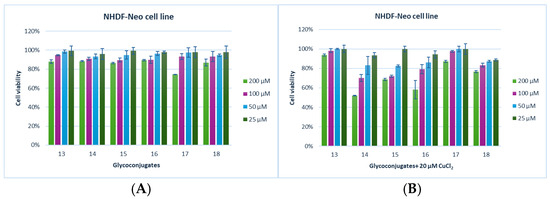 The dependence of NHDF-Neo cell proliferation on the concentration of glycoconjugates 13–18 in the absence (A) and the presence (B) of 20 µM of Cu2+ after 24 h incubation. Cells in a culture medium (A) or cells in a culture medium with the addition of CuCl2 at 20 µM (B) were used as a reference for 100% cell viability. Data are presented as the mean ± standard deviation (n = 3).
