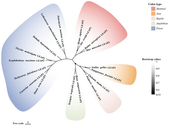 Phylogenetic relationship of the LEAP-2 gene in vertebrate. The phylogenetic tree of 18 full-length protein sequences was constructed by MEGA 11. The phylogenetic tree was established by the neighbor-joining method, bootstrapping with a parameter of 1000 repeats, the pairwise deletion method, and the p-distance selection method. GenBank accession numbers of the selected sequences are listed in Table 1.