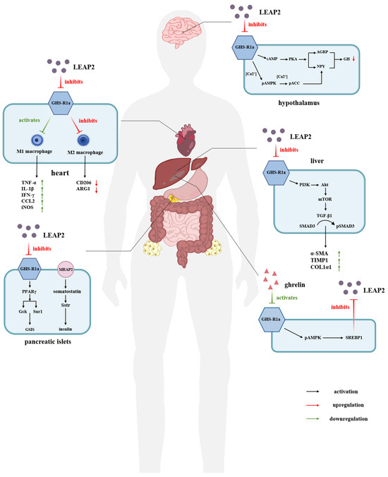 Therefore, LEAP-2 can prevent the binding of ghrelin by binding to GHSR1a and acts as a potent inhibitor of ghrelin in vivo [44,45,46]. This dual role allows LEAP-2 to play a pivotal part in regulating energy metabolism through the ghrelin–GHSR1a signaling pathway. Furthermore, LEAP-2 may offer therapeutic potential by modulating ghrelin-related responses under both normal and pathological conditions [43,47]. The regulation and effects of LEAP-2 antagonism against GHSR1a on human organ metabolism or disease are shown in Figure 2.