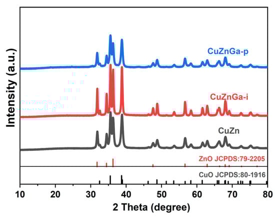 The crystalline phases of the catalyst materials were examined by XRD, and the resulting patterns are presented in Figure 1. The XRD pattern of the CuZn catalyst shows diffraction peaks corresponding exclusively to ZnO (JCPDS 79-2205) and CuO (JCPDS 80-1916). No additional phases were detected, which is consistent with the expected phase composition. The XRD pattern of the CuZnGa-i and CuZnGa-p catalysts closely resembles that of the binary CuZn catalyst. And no diffraction peaks attributable to Ga or its oxides were detected in the CuZnGa-i and CuZnGa-p catalysts. This absence suggests that the Ga species are highly dispersed, likely existing as amorphous metals or integrated into the lattice of the support or other components []. The simultaneous presence of phases CuO and ZnO confirms a composite crystal structure. Owing to the high molar content of Cu and Zn, the diffraction peaks from the CuO and ZnO phases are the most intense features in the patterns of all three catalysts. Furthermore, the introduction of liquid metal Ga by the physical mixing method appears to have little effect on the CuZn crystal structure, whereas the impregnated CuZnGa-i catalysts enhanced the overall crystallinity of the catalyst.