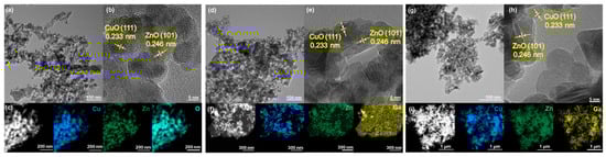 (a–i) HRTEM images and STEM-EDS elemental mapping of used CuZn (a–c), CuZnGa-i (d–f), and CuZnGa-p (g–i).