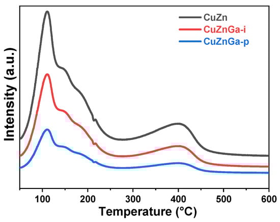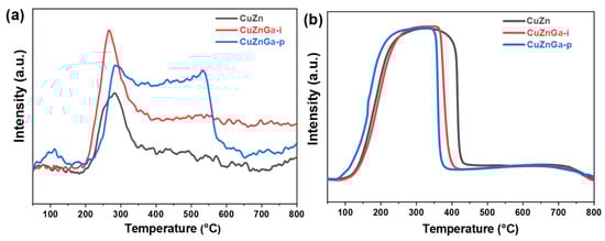 As shown in Figure 3a,b, we conducted investigations to evaluate the chemical adsorption and reduction behavior of the catalyst. CO2 adsorption and desorption are crucial processes in CO2 hydrogenation to methanol. Characterization demonstrates that only the CuZnGa-p catalyst exhibits a low-temperature desorption peak near 100 °C, indicative of weak physical adsorption on its surface. Furthermore, the desorption peaks observed in the mid-temperature range (200–600 °C) are predominantly attributed to the presence of alkaline oxygen vacancies, which are primarily responsible for CO2 activation [,]. The broad peak here may consist of a primary desorption peak at 200–400 °C and a secondary desorption peak above 400 °C. The primary desorption peak in the mid-temperature range primarily serves to activate CO2, while the secondary desorption peak in the high-temperature range promotes the occurrence of side reactions. All three catalysts exhibit distinct CO2 desorption peaks. Notably, the incorporation of liquid gallium significantly enhances the total desorption area, which is most pronounced for the CuZnGa-p catalyst. The largest desorption area correlates with its superior CO2 activation capacity. H2-TPR profiles of the three catalysts exhibit similar reduction curves with largely comparable peak areas. The incorporation of liquid gallium is observed to slightly lower the reduction temperature of Cu-ZnO-based catalysts [].