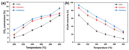 In the CO2 hydrogenation process for methanol synthesis, a significant competing side reaction is the reverse water–gas shift (RWGS) reaction (CO2 + H2 → CO + H2O), which leads to parallel reaction pathways and reduced selectivity toward methanol. Consequently, CO was identified as the primary by-product during product analysis, with other by-products being virtually absent. This indicates that the reverse water–gas shift reaction is the dominant side reaction, with methanol selectivity being the primary optimization challenge. The CO2 hydrogenation performance of the three synthesized catalysts was evaluated, as presented in Figure 5a,b. Consistent with thermodynamic expectations, elevated reaction temperatures enhanced CO2 conversion. However, they also favored the reverse water–gas shift (RWGS) reaction, resulting in increased CO selectivity. Consequently, higher reaction temperatures led to a reduction in methanol selectivity. As shown in the CO2 conversion and methanol selectivity profiles, the CuZnGa-p catalyst exhibits the highest CO2 conversion and methanol selectivity among the series under identical reaction conditions, followed by CuZnGa-i. In contrast, the CuZn catalyst showed the lowest activity and preferentially catalyzed the RWGS reaction, leading predominantly to CO formation. The CO2 conversion rate of the unmodified CuZn catalyst increased from 2.1% to 12.0% with increasing temperature, whereas the methanol selectivity decreased from 68.4% to 9.5%. In contrast, the CO2 conversion rate of the CuZnGa-p catalyst increased from 5.4% to 15.0% as the temperature increased, whereas the corresponding methanol selectivity declined from 94.6% to 27.3%. Considering that liquid Ga and the Cu–ZnO catalyst were only physically mixed and thus had little impact on the textural structure, the observed enhancement in CO2 conversion and methanol selectivity can be attributed to the high fluidity of the liquid phase, which effectively suppresses carbon deposition. This inhibition of coke formation prevents the blockage of active sites, thereby improving the overall catalytic performance.