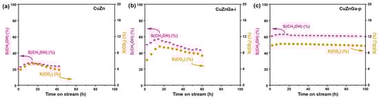 Catalysts stability test for (a) CuZn, (b) CuZnGa-i, and (c) CuZnGa-p at 4 MPa, H2/CO2 = 3:1, 240 °C, and 7500 mL∙gcat−1∙h−1.