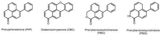 Prior studies of the family, conducted by the Marine and Terrestrial Natural Product (MATNAP) group at RMIT University, have to date yielded the discovery of twenty-nine new compounds, primarily of the ‘phenylphenalenone’ (PhP) structure type including derivatives such as ‘oxabenzochrysenones’ (OBCs) and ‘phenylbenzoisochromenones’ (PBICs). These compound classes, along with ‘phenylbenzoisoquinolindiones’ (PBIQs) (Figure 1), are the main secondary metabolites of interest isolated from the family Haemodoraceae (collectively referred to henceforth as ‘PhP-type compounds’) and are notable for their distinct chromophores as well as their documented anti-microbial activity [1,5].