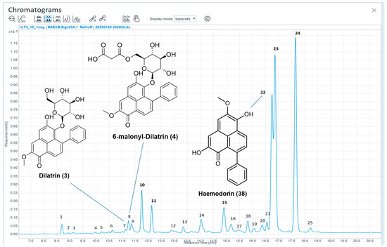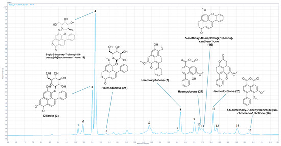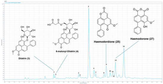Previously reported compounds were identified by comparing the experimental data with the literature data from the internal Haemodoraceae secondary metabolite database (see S1 in the Supporting Information file), specifically matching UV-visible chromophores as well as comparison of the mass spectra with known molecular masses. An example of the process adopted is illustrated in the identification of the known phenylphenalenone glycoside dilatrin (3), which was identified as a major component of the bulbs of H. simulans [40,41], is provided.