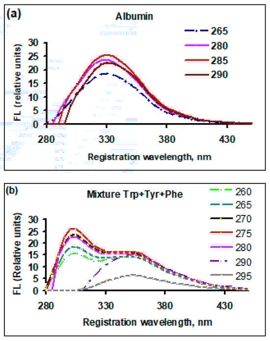 The fluorescence of amino acids in bound and free states within the protein albumin and in a mixture of amino acids in a solution with an amino acid, in which the ratio of its concentration was similar to that in albumin, was studied at different excitation wavelengths. The results are presented in Figure 1.