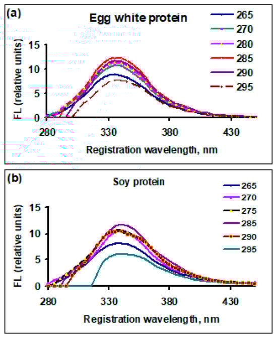 For both types of protein, the maximum emission (yield) of fluorescence was achieved at the same excitation wavelength (285 nm). The position of the fluorescence emission maximum did not depend on the excitation wavelength and was 335 nm for egg white protein and 340 nm for soy bean protein.