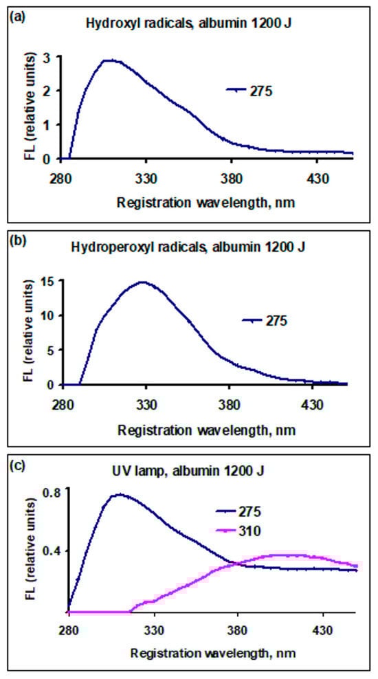 In the albumin solution after treatment with hydroxyl radicals using a plasma generator (Figure 3a), the maximum wavelength emission position shifted from 330 to 310 nm. After treatment with hydroperoxyl radicals, the maximum position did not change. Under the influence of UV lamp radiation, the maximum shifted to 310 nm and a line appeared at the excitation wavelength of 310 nm with a maximum at the registration wavelength of 410 nm. The shift in the maximum was due to the rapid consumption of tryptophan compared to tyrosine and the decrease in the contribution of tryptophan to the total yield.