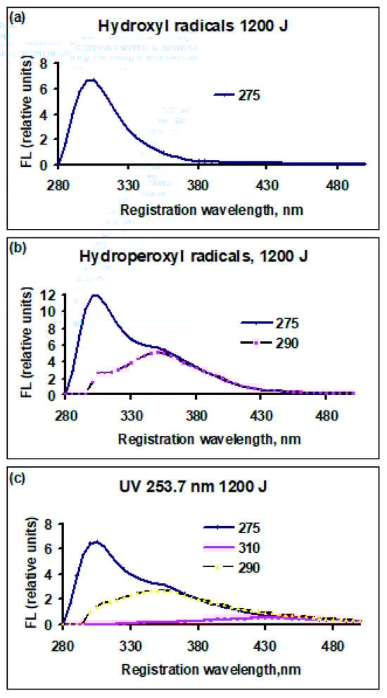 The dependence of the fluorescence yield of amino acid solutions, similar in composition to bovine serum albumin, FL (relative units), on the registration (emission) wavelength, nm, treated by active species, dose 1200 J (10 mL)−1: (a) cold plasma, radicals •OH; (b) pulse plasma radiation, radicals ; (c) UV radiation λ = 253.7 nm. The numbers on the right of each graph: excitation wavelengths, nm.