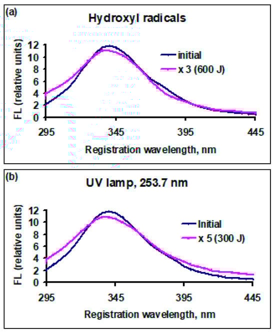 In the mixture of amino acids, tryptophan + tyrosine + phenylalanine, where the molar concentration ratios of the amino acids were the same as in the protein albumin, each amino acid fluoresced independently, with two observed emission lines caused by tryptophan and tyrosine (Figure 4). The fluorescence of phenylalanine was low and not noticeable. The values of for both types of radicals and continuous UV radiation were approximately the same (Table 4). However, the number of tryptophan molecules was much lower than that of tyrosine. Therefore, in the process of destruction of the dissolved mixture, tryptophan was consumed faster than tyrosine; the emission line of tryptophan disappeared, leaving only the emission line of tyrosine.