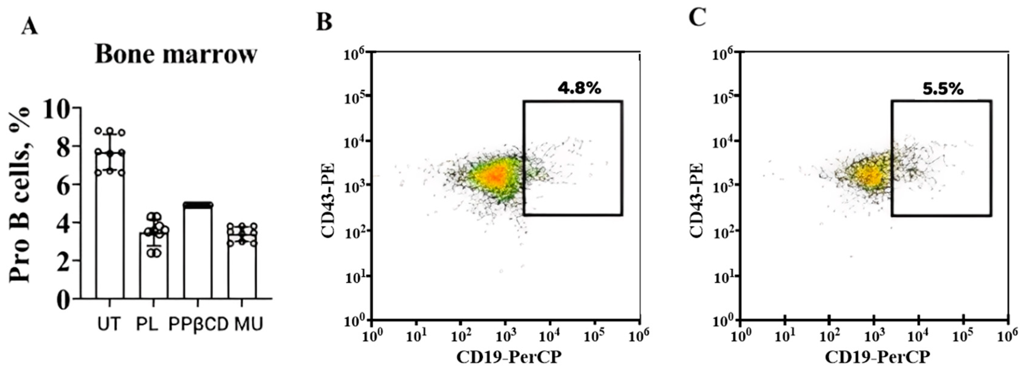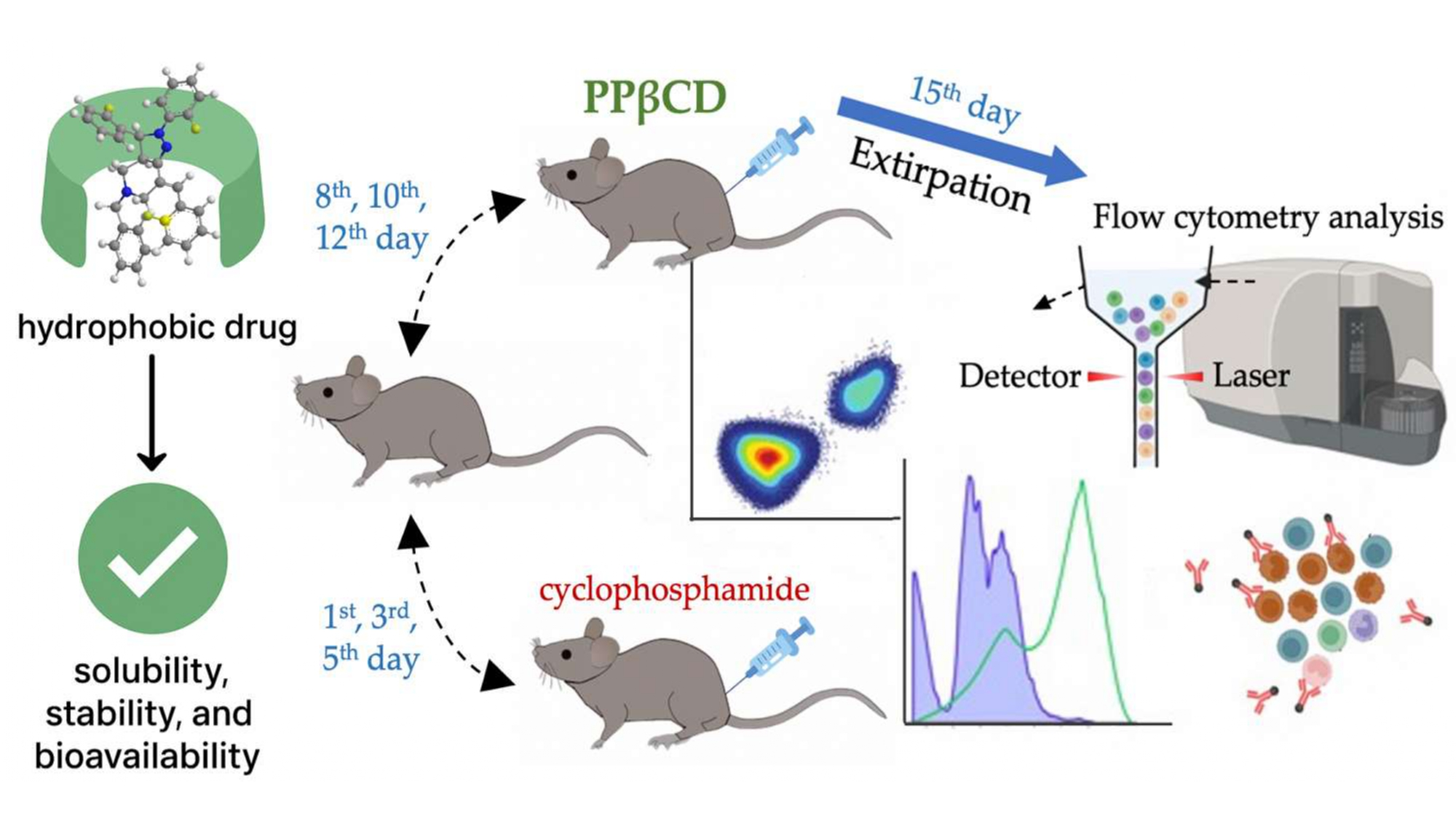 Cyclophosphamide (Baxter Oncology GmbH, Halle, Germany) was dissolved in 0.9% physiological saline and administered intramuscularly to the PL, PPβCD, and MU groups at a dose of 40 mg/kg (0.25–0.3 mL of 4% solution) at 09:00 on days 1, 2, and 3. From days 6 to 8, at 09:00, the following intramuscular injections were administered: