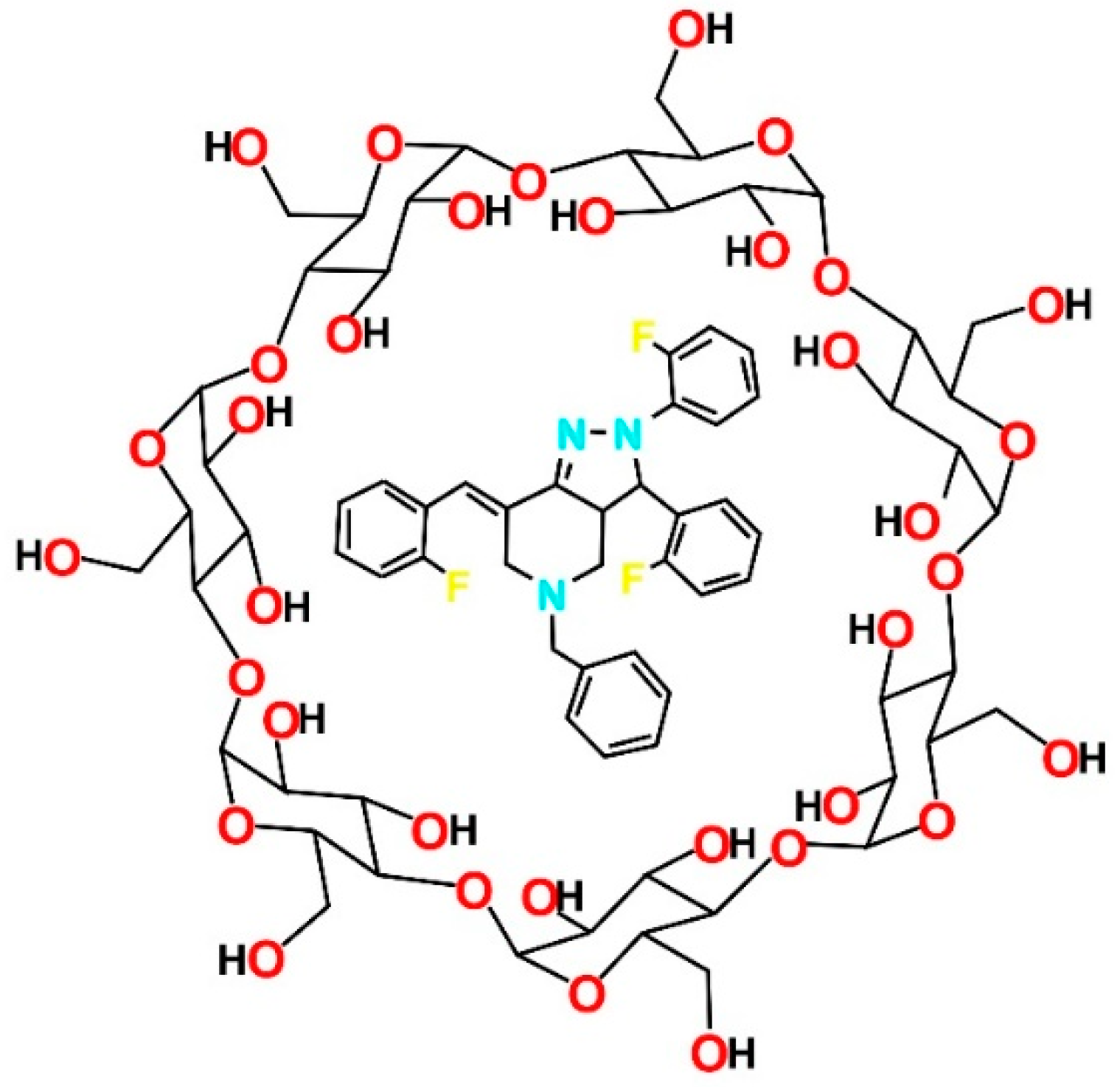 25]. The chemical structure of the β-CD inclusion complex of 5-benzyl-7-(2-fluorobenzylidene)-2,3-bis(2-fluorophenyl)-3,3a,4,5,6,7-hexahydro-2H-pyrazolo[4,3-c]pyridine (