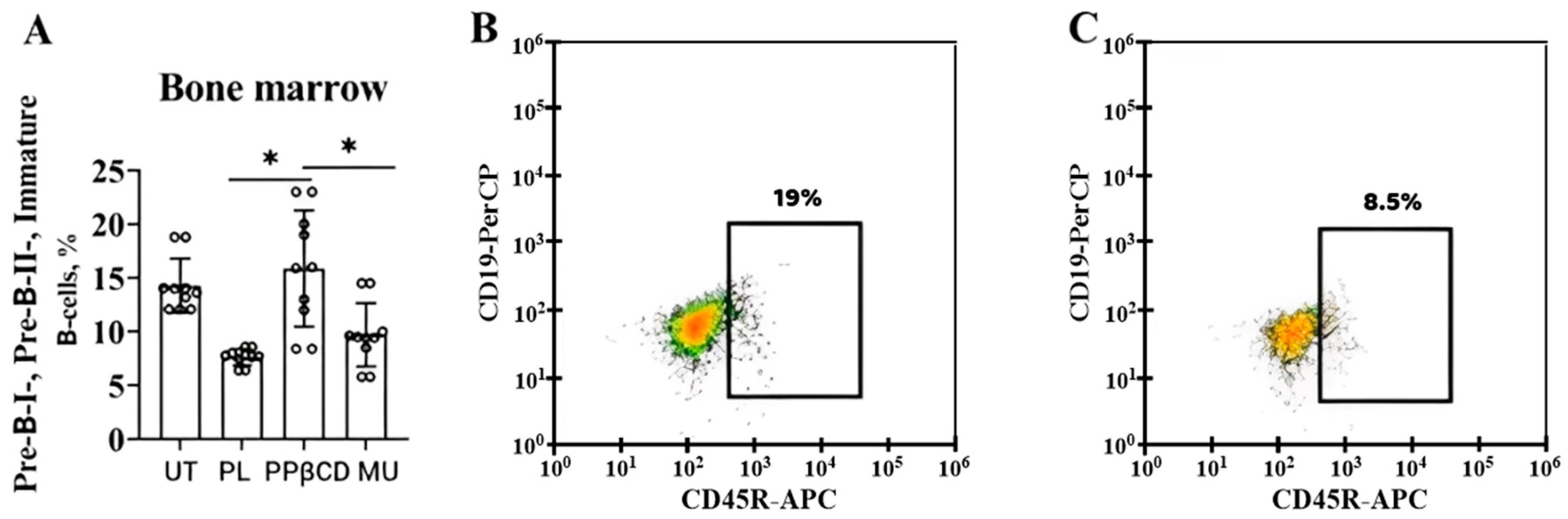 Cyclophosphamide (Baxter Oncology GmbH, Germany) was dissolved in 0.9% physiological saline and administered intramuscularly to the PL, PPβCD, and MU groups at a dose of 100 mg/kg (0.05 mL of 4% solution), at 09:00 on days 1, 3, and 5. On days 8, 10, and 12, at 09:00, the following treatments were administered intramuscularly: