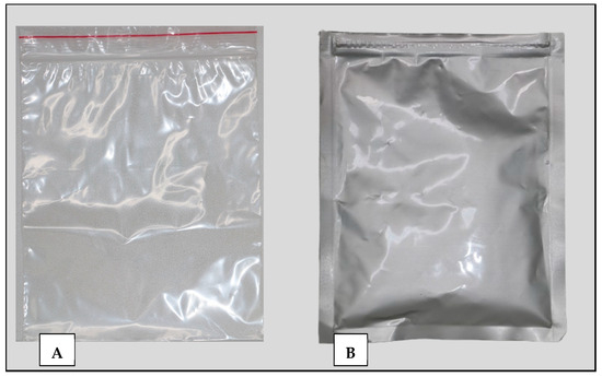 Packaging types used to store Moringa oleifera leaf powder. (A) transparent packaging; (B) opaque packaging.