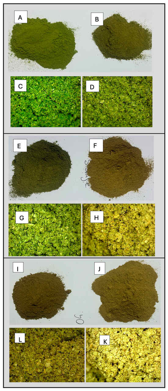 Effect of packaging and temperature treatment on colour of Moringa oleifera leaf powder as viewed and photographed using a Digital Canon EOS D70 15–135 mm lens Camera (EOSD70) and QY-X03 HD colour High-Resolution Digital Microscope (HDHRM). (A–D) Material storage at 4 °C [(A)—opaque packaging (EOSD70); (B)—transparent packaging (EOSD70); (C)—opaque packaging (HDHRM); (D)—transparent packaging (HDHRM)]. (E–H) Material storage at 25 °C [(E)—opaque packaging (EOSD70); (F)—transparent packaging (EOSD70); (G)—opaque packaging (HDHRM); (H)—transparent packaging (HDHRM)]. (I–K) Material storage at 40 °C [(I)—opaque packaging (EOSD70); (J)—transparent packaging (EOSD70); (K)—opaque packaging (HDHRM); (L)—transparent packaging (HDHRM)].