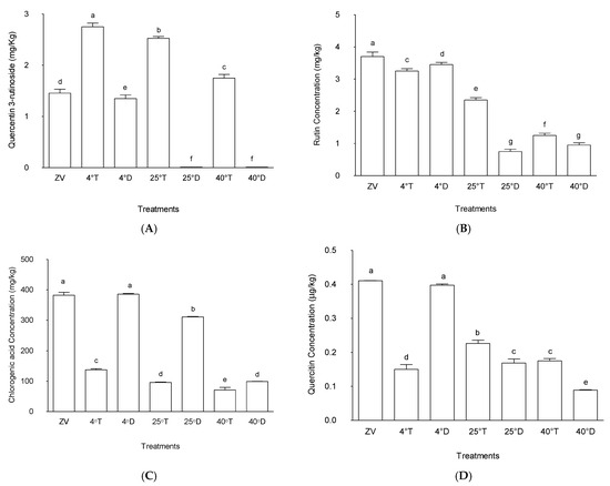 Effect of different storage conditions on (A) quercetin-3-rutinoside, (B) rutin, (C) chlorogenic acid, and (D) quercetin concentrations in Moringa oleifera leaves. ZV—zero-value baseline results of material analyzed before storage; 4 °T—storage at 4 °C with transparent packaging; 4 °D—storage at 4 °C opaque packaging; 25 °T—storage at 25 °C with transparent packaging; 25 °D—storage at 25 °C with opaque packaging; 40 °T—storage at 40 °C with transparent packaging; 40 °D—storage at 40 °C with opaque packaging. n = 6 per treatment. Results are expressed as the mean values ± standard error (n = 6) including control; bars in the same column marked with different letters indicate significance difference at p ≤ 0.05.