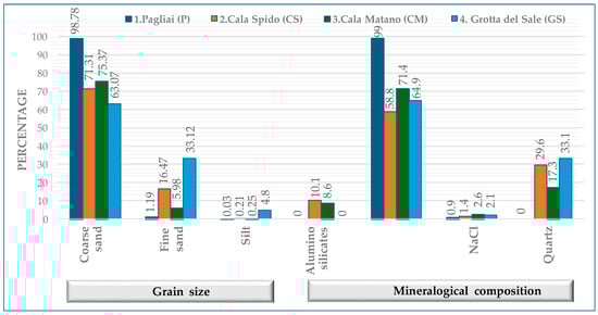 Figure 1 shows that along the San Domino coast, there is a variation in sediment grain size and mineral content. At P (10.3 m), sediments are dominated by coarse sand and dolomite, characteristic of a high-energy environment. Moving to CS (10.0 m), fine sand increases, and the mineral composition changes with the appearance of quartz, calcite and Fe-bearing dolomite. This suggests a shift toward a moderately lower-energy environment with more varied sediment sources. At CM (15.0 m), the mineral assemblage includes aragonitic calcite, aragonite and Fe-bearing dolomite, indicating a combination of biogenic and terrigenous inputs. Aragonite, less stable than calcite, can arise from marine organisms such as corals and shell-producing fauna. Its presence, along with aragonitic calcite, points to active biogenic contributions, while its eventual transformation into calcite reflects ongoing diagenetic processes. Finally, GS (19.0 m) contains the finest sediments and the most varied mineralogy, including quartz, calcite and dolomite. Calcite, formed via biochemical processes in sedimentary environments and the most abundant mineral in the dataset, is consistently associated with finer grain sizes across the sites, supporting the observed trend of increased mineralogical complexity and carbonate accumulation in lower-energy zones.