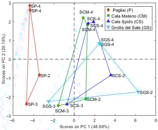 BCR results indicate that Cu, Pb and Mn were the most bioavailable elements, with residual fractions below 30% at CS and CM. These sites also correspond to finer sediments, confirming the role of grain size in enhancing TE mobility. Conversely, Zn, Fe and Al were mainly residual (>50–90%), suggesting limited bioavailability. From an ecological perspective, the bioavailable fraction of Cu and Pb may induce oxidative stress and growth inhibition in benthic fauna, while Mn, although essential, may become toxic at elevated concentrations [,]. To further explore the temporal variability of metal concentrations of samples from July 2023 (SCS-2, SGS-2, SP-2, SCM-2), September 2023 (SCS-3,SGS-3,P-3,CM-3) and January 2025 (SCS-4, SGS-4, SP-4, SCM-4) and their associations with sediment characteristics, PCA-score plot and correlation analyses were applied.