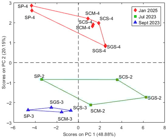 The PCA score plot in Figure 4 reports data grouped according to the sampling date. It reveals a clear temporal separation of the samples collected in 2023 and 2025, particularly along PC2 (20.15%). Samples from 2025 (red) are distinctly shifted from those collected in July and September 2023 (green and blue), indicating significant changes in elemental composition over time. The loading plot (Figure 2) shows that this temporal differentiation is primarily driven by increased levels of metals with positive loadings on PC2.