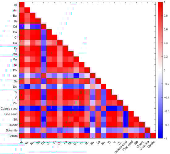 Pearson correlation matrix among metal concentrations, most abundant mineralogical fractions (quartz, dolomite, calcite) and granulometric components (coarse sand, fine sand, silt).