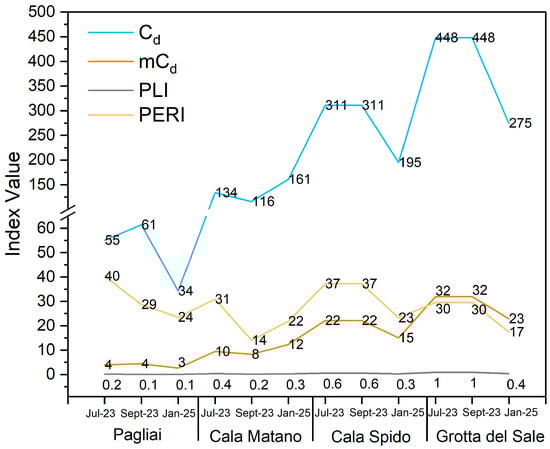 Temporal variation in pollution indexes (Cd, mCd, PLI and PERI) across four sampling sites over three sampling times (July 23, September 23 and January 25).