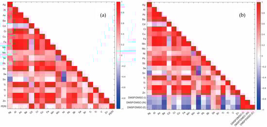Figure 7 shows the correlation matrices of trace element concentrations (from 2023) for two ecological factors (from 2023): the PERI and the DMSP/DMSO ratio in leaves of P. oceanica, providing insight into the behavior and potential impact of metals in Posidonia oceanica meadows, which are regressing. The DMSP/DMSO ratio is defined as the ratio of dimethyl sulfoniopropionate (DMSP) to dimethyl sulfoxide (DMSO) concentrations. This ratio is used as an indicator to evaluate oxidative stress levels in the plant, as naturally present DMSP is oxidized to DMSO under stress, causing the ratio to decrease. A higher DMSP/DMSO ratio indicates lower oxidative stress []. The correlation matrix a shows a positive correlation between metal in sediment and PERI, which is logical since the higher the metal concentration, the higher the PERI; e.g., Cd, Cu, Mo, Pb, Sn and Tl show a medium–strong positive correlation. The correlation matrices for Posidonia oceanica (Figure 7b) derive from previously published data [] and are reported solely to provide ecological context. No direct measurements on seagrass tissues were conducted in this work. The matrix b shows a general negative correlation between TE content and DMSP/DMSO ratio in every type of P. oceanica leaf, which is correct since a low ratio indicates a high oxidative stress of the plant except for Cd, Mo, Se and Sn, which show a positive but not significant correlation since the DMSP/DMSO ratio may depend on different environmental factors. This pattern suggests that, even in the absence of updated biotic data, metals may be related to the health status of the plant.
