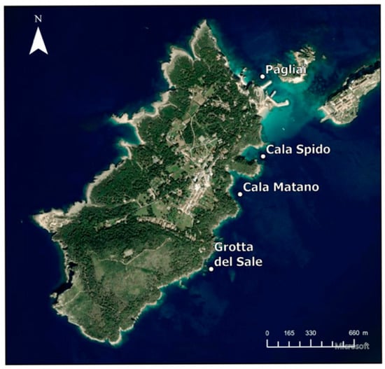 San Domino Island view with sampling sites. Map elaborated by the authors using ArcGIS Pro 3.3 (licensed academic version).