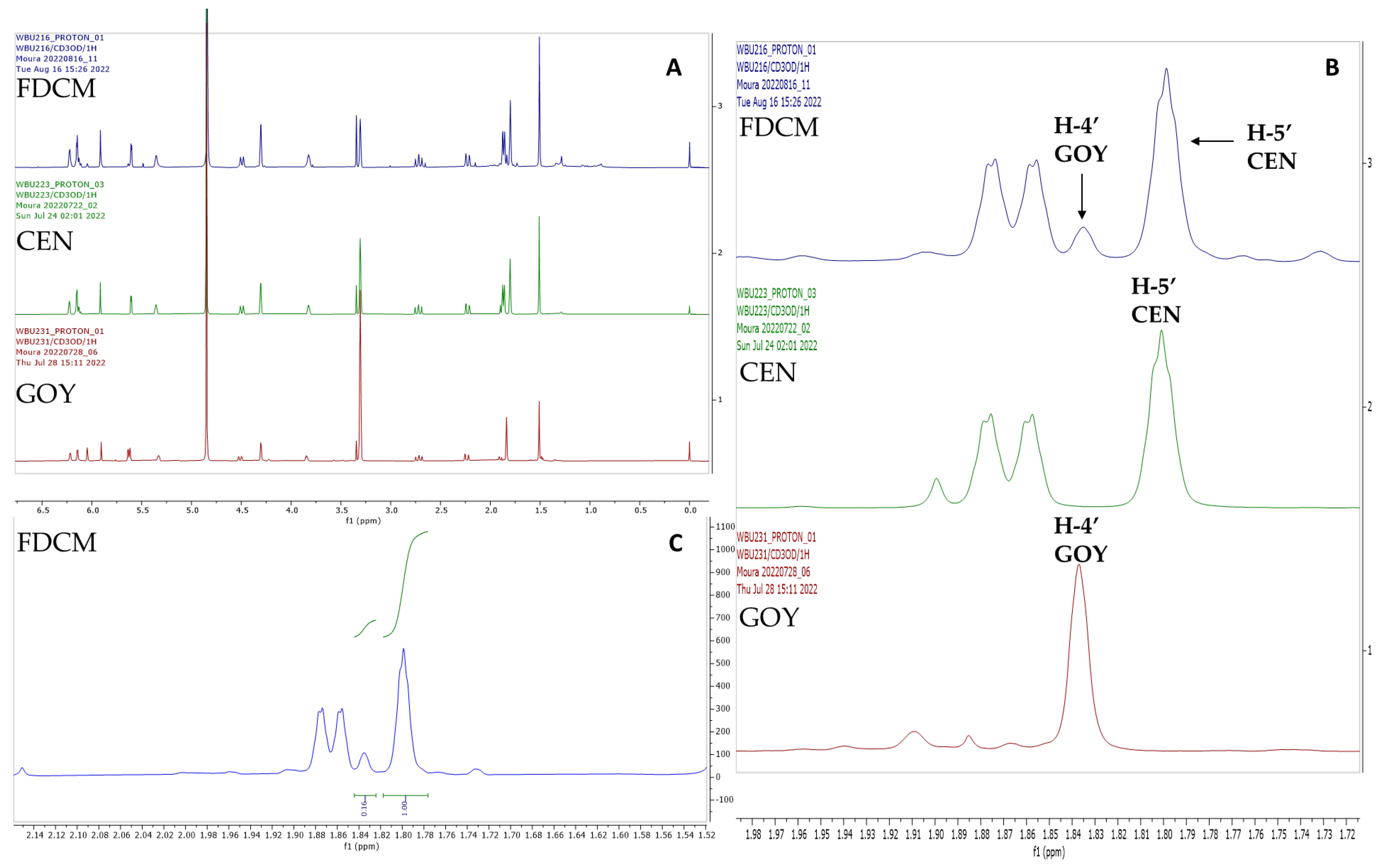 - Soares, A.C.F.; Silva, A.N.; Matos, P.M.; Silva, E.H.D.; Heleno, V.C.G.; Lopes, N.P.; Sass, D.C. Complete 1H and 13C NMR Structural Assignments for a Group of Four Goyazensolide-Type Furanoheliangolides. Química Nova 2012, 35, 2205–2209. [Google Scholar] [CrossRef]