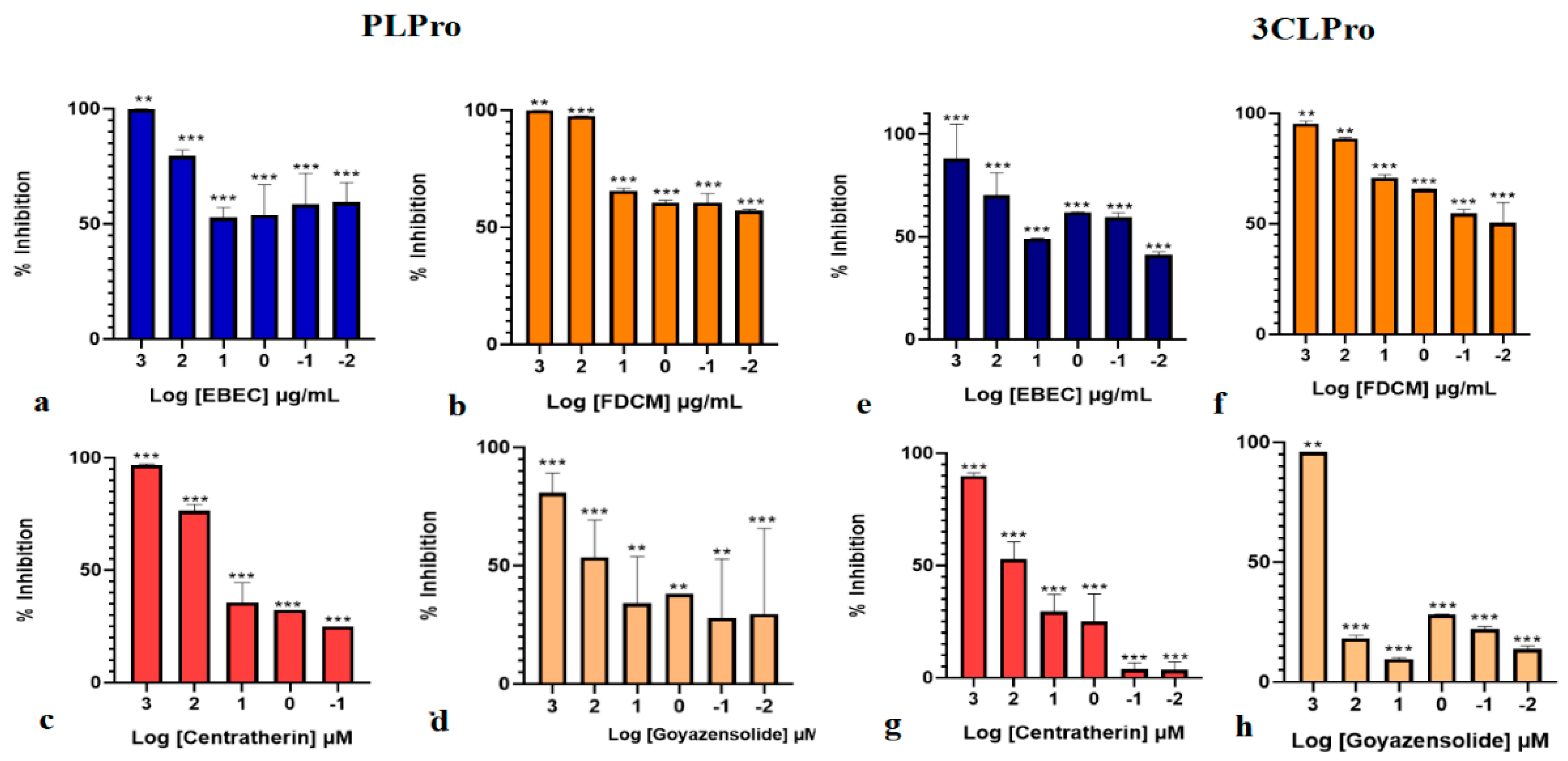 3.6.2. Screening of Plant Extract, Fraction and Isolated Compounds for Inhibition of SARS-CoV-2 PLpro and 3CLpro Enzymatic Assay