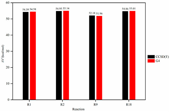 The precision of energy barriers is crucial for ensuring the reliability of rate coefficients [16]. Consequently, the G4 composite method, which is less computationally demanding, has been selected as the high-level ab initio method for the correction scheme in isodesmic reactions. To validate the consistency of the G4 method for our specific systems, a comparative analysis with CCSD(T)/cc-pVTZ calculations has been performed in this work. A selection of four representative reactions (R1, R2, R9, and R10) from Table 1 was chosen for this purpose, with detailed findings shown in Figure 2.