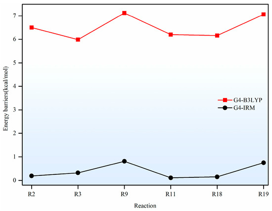 As depicted in Figure 2, the energy barriers calculated by both methods show excellent agreement, with deviations of only −0.19 kcal/mol, −0.19 kcal/mol, 0.22 kcal/mol, and −0.15 kcal/mol, respectively. This close correspondence, well within the range of chemical accuracy (1~2 kcal/mol), confirms that the G4 method delivers energetics consistent with other high-level theory for these reactions.