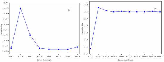 The influence of the carbon chain length on the energy barriers. (a) acetic acid ester series; (b) ethyl ester series.