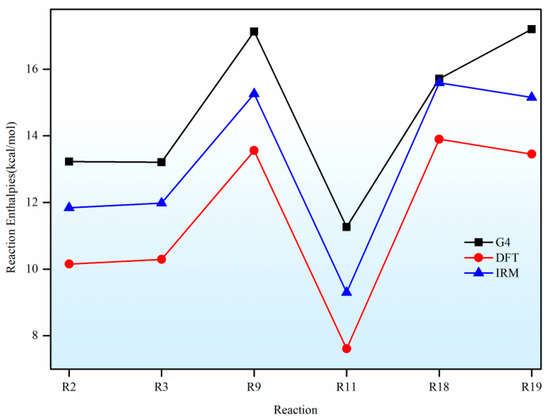 The reaction enthalpies calculated by the B3LYP, G4, and isodesmic reaction method (IRM).