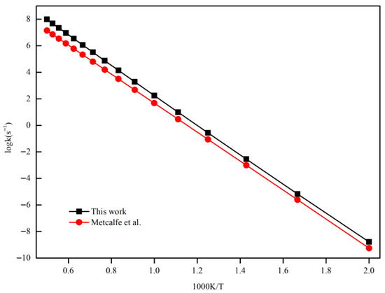 A direct comparison of the rate coefficients calculated in this work with experimental values is challenging due to the scarcity of experimental data that isolates the specific unimolecular alkene elimination pathway from other concurrent decomposition channels (e.g., C-C bond fission) in complex combustion environments. Only a few studies have been performed regarding the rate coefficients at the high-pressure-limit of the unimolecular elimination reactions for fatty acid alkyl esters. For instance, Metcalfe et al. [9] determined the rate coefficients for methyl propanoate. A comparison of these computed rate coefficients with existing research data is illustrated in Figure 6. Additionally, the rate coefficients calculated by us and those given by Metcalfe et al. [9] at temperatures of 500 K, 1000 K, 1500 K, and 2000 K are presented in Table 7.