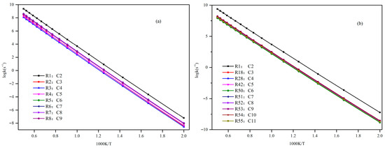 where k is the rate coefficients for target reaction calculated at the low-level (B3LYP) ab initio method, and k′ is the corrected rate coefficients for the target reaction within the isodesmic reaction method. is the correction scheme for energy barriers from the reference reaction in Equation (5).