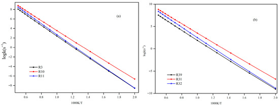 Furthermore, the influence of the degree of branching for alkyl chain on the rate coefficients was investigated through a comparison of linear, α-branched, and β-branched isomers within the temperature range of 500~2000 K, which are listed in Figure 8. The results indicate that the rate coefficients of the α-branched isomers (R10, R31) are higher than those of the linear isomers (R3, R39). This tendency is also in line with the reduction in the energy barrier discussed earlier. Nevertheless, a notably perceptive trend is discerned for the β-branched isomer, R11 and R32. Although it demonstrates a slightly higher energy barrier in comparison to its linear analog, R3 and R39, the calculated rate coefficients are comparable or even marginally larger throughout the investigated temperature range.