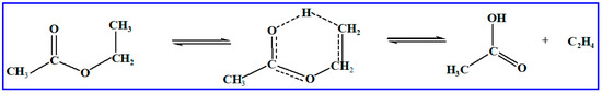 Unimolecular alkene elimination reaction of ethyl acetate with six-membered transition state: ethylene and acetic acid formation.